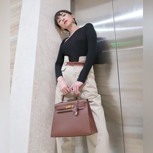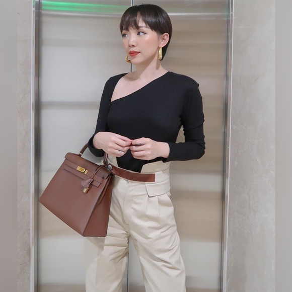 the set includes the asymmetric neckline black bodysuit and beige pant. brand new never worn. Fits like US Small.