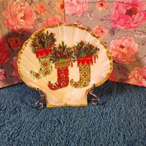 Scallop Shells All my decoupage shells are made by me. This shell is called a Scalloped shell. Every shell has its charastics. These Scalloped shells were homes to a living creature once. Possibly have bumps and grooves from growth. This shell is 5 inches. The colors are multicolored. I glazed the shell with 2 types of glaze, front, and back. Adding a gold handpainted edge. My shell can either be placed on a stand to show off any room. Or can be used laying down as a trinket dish or empty. It will make a nice gift for any occasion. A complimentary clear plastic stand comes with it.