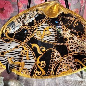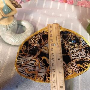 This shell is 6 1/4 inches by 4 3/4 inches The colors are black, gold and white. I glazed the the shell with 2 types of glaze, front and back. Adding a gold handpainted edge.