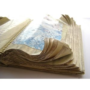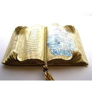 The book has been altered by using stiff glue, decoupage, and ephemera. After the decoupage was dry, the pages were glazed a gold-bronze.