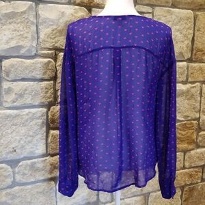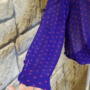 Gorgeous purple with hot pink triangles. Front has a crisp cross style, long sleeves with the ability to roll up and button. Sheer