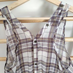 Really lightweight plaid top with functional buttons down the entire front and matching decorative buttons on the back. Top has a very loose fit and high-low cut.
