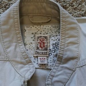 Light weight jean. 3/4 inch sleeve. Ruffled all the way around the edge. Super cute. Size S. Taupe in color. Worn 1 time.