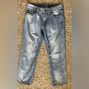 Decree Jeans, size 33X30, slim straight, light blue, distressed finish, detailed back pockets, great condition.