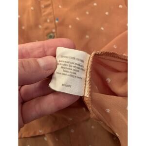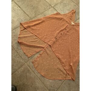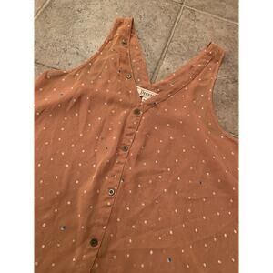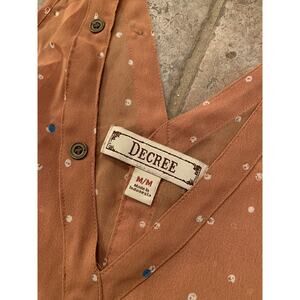 Worn, but overall very good condition. Decree Medium Sheer V Neck Hi Lo Tank Top Mustard Yellow Gold with White Polka Dot Detail...every once in a while there is some blue spots to give some depth. Front and Back V Neck. Buttons up and down the front and back...they are not buttonable...more for style, than purpose. Flowy with a Boho feel. Slit bottom back hem.