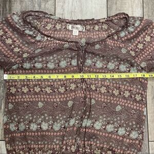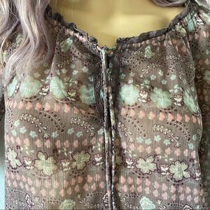 Gently used, elastic waist and elastic at wrist cuffs, can be worn on or off shoulders, tie front and buttons at the top, material is slightly sheer, see pictures.