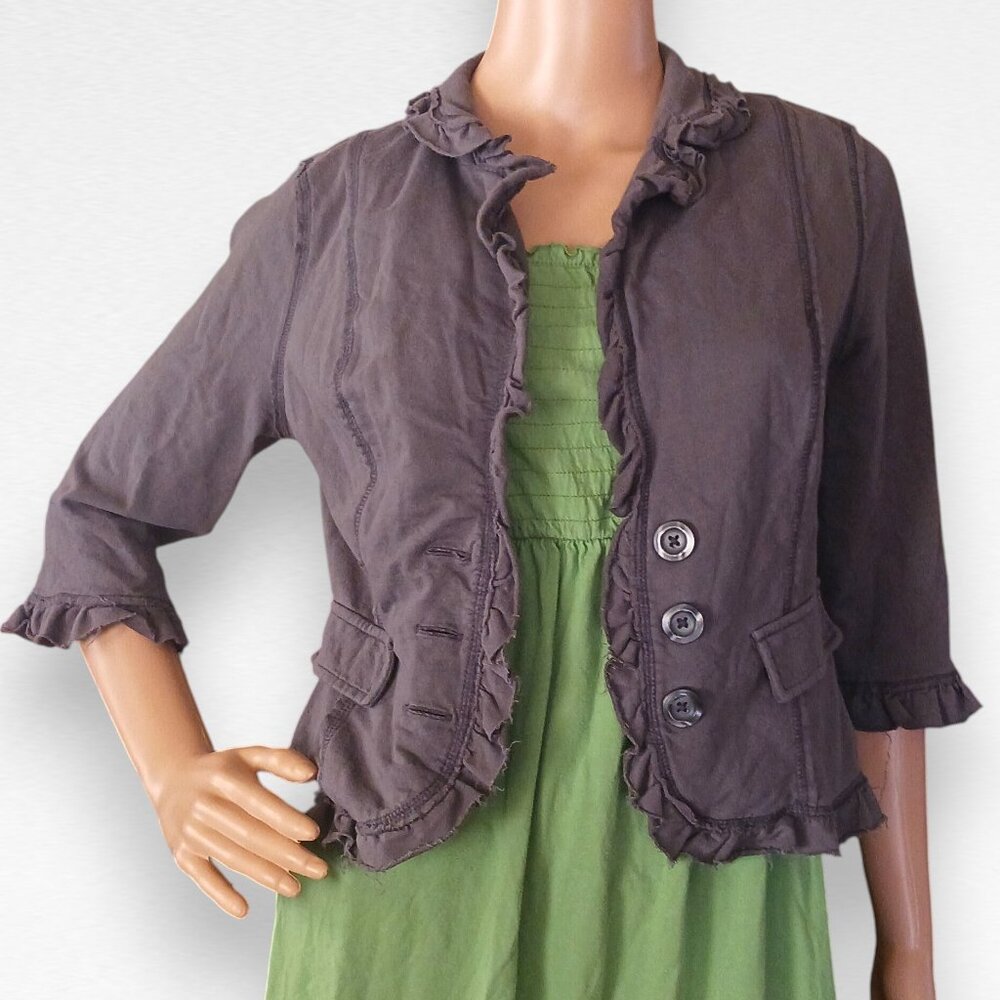 This gray jacket features 3/4-length sleeves, a buttoned closure, faux pockets, and raw-edged ruffle details throughout. It is in great condition.