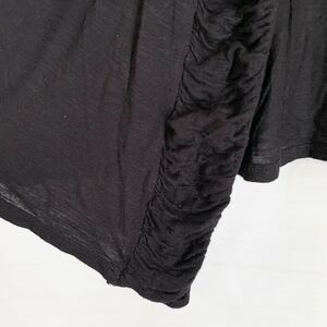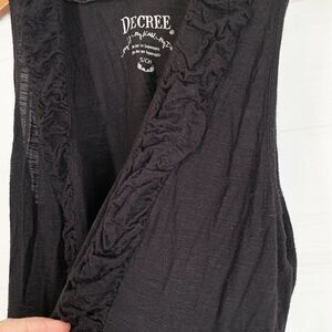 Here is a fun Decree open front top layer! It's women's junior size Small and solid black. It's got ruched edge trim and the front is longer than the back. There is a peplum waist with elastic. Lightweight knit, 100% rayon. Gently preowned.