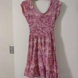 Decree Sundress size Juniors Small. Pink, White, Orange, and Yellow multicolored sundress. Opened back with Criss Cross and Little tight Sleeves. Slightly Worn, but still in great condition.