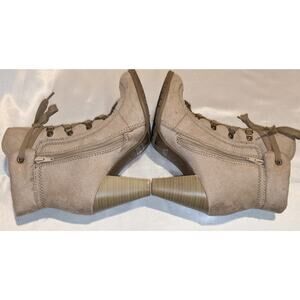 This is a Cute Pair of Decree Women's Beige Vegan Suede Ankle Boots with Side Zip in Size 7.5 M. They have 3.25" Stacked Heels. They have a few small spots of dirt/discoloration, but are otherwise in very good pre-owned condition. Please see pics for details.