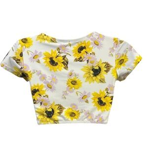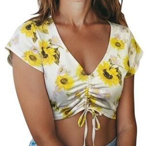 Keywords: crop top, sunflower print, floral top, v neck top, drawstring top, summer top, womens top, casual top, decree, short sleeve top, daisy print, boho top, festival top