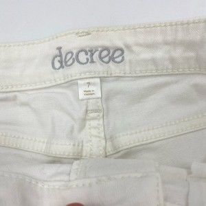 Decree women’s short white bootie frayed mid waisted shorts size 7, pre-owned, No stains or holes ! Good condition. Care: Machine Washable, material: 98% cotton, 2% spandex, approximate measurements laying flat- waist: 14 7/8”, rise: 10”, inseam: 3”, leg hole: 9”