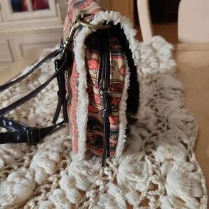 Decree Aztec print brown and orange crossbody bag with saddle flap