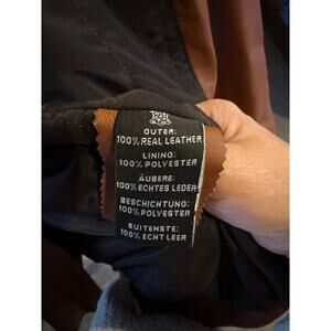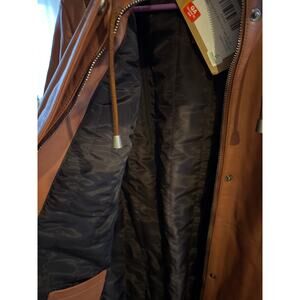 Brand new with tags attached. A beautifully tailored real leather parka in a rich cognac shade with cozy faux fur trim at the hood. Mid-thigh length with quilted lining — stylish warmth without bulk.