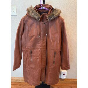 Decrum Women’s Real Leather Hooded Parka Coat Cognac Faux Fur Trim – Size XL NWT