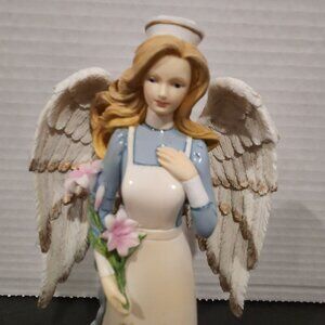 Celebrate the caring spirit of a nurse with this beautiful porcelain figurine. Prayers for an Angel of Mercy Collection " Dedicated to Caring Angel Nurse " is a nurse holding flowers "Bless This Angel of Mercy Who Cares for All with a Tender Heart" on her dress