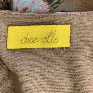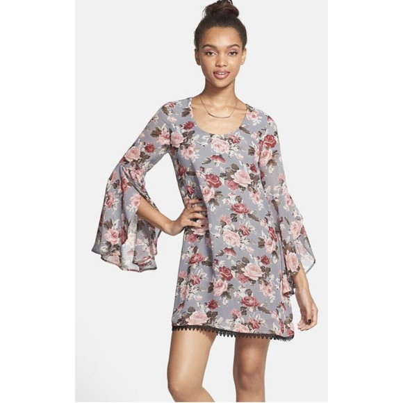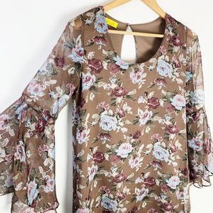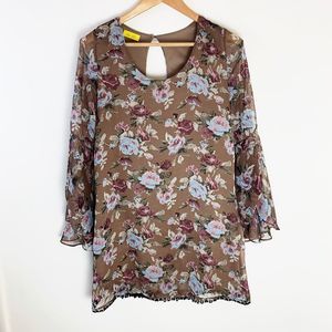 Dee Elle Shift Dress Medium Brown Floral Print Flared Bell Sleeve Crochet Boho M