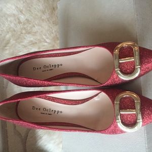 Original, sleek , Ruby Red pumps from luxury brand Dee Ocleppo worn by celebrities. Stand out in a crowd. Pivot from the boardroom to the ballroom in these strikingly unique heels. Made in Italy. Perfect condition never been worn.