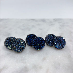 Deep blue faux druzy stones in 12mm gunmetal settings. Comes with plastic earring backs and on earring cards.