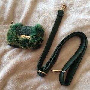 Deep Green Purse with Real Fur Accents - Comes with additional 5" x 4" coin purse and shoulder strap!!! Faux leather.