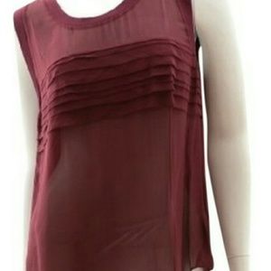 PKJ Patterson J Kincaid semi-sheer maroon tank top with ruffles at front. Flattering and feminine, it can easily be dressed up or down, for day or night. Great for work when paired with a blazer. Very lightweight.
