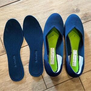 Rothy’s ‘Deep Ocean’ round toe flats. Excellent used condition. Size 9. No flaws. Non smoking home. They’re a dark teal color. Bought brand new myself from Rothy’s website. Shoes have never been washed or dried. I have washed/air dried the inserts.