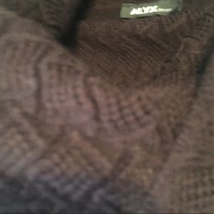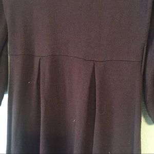 Long-sleeved, pleated skirt, deep plum purple color, knitted cowl neck.