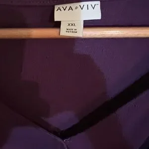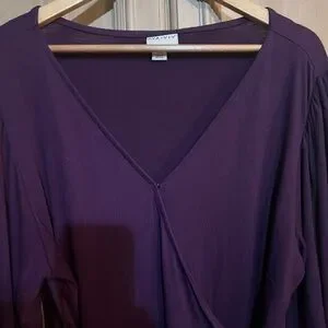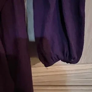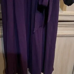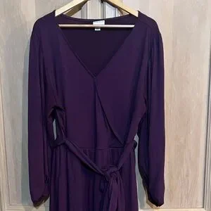 Soft lightweight polyester knit dress in purple, long sleeves with elastic wrists, sash belt, and a V-neck with a hook closure. Excellent condition.