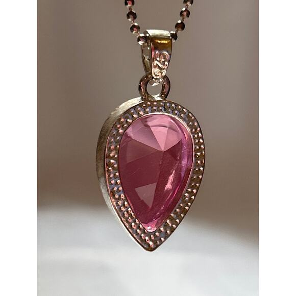 The stone changes from a deep pink to a magenta red with the light. Open back of stone enhances the reflective brilliance of the facets. Both the clasp and bail are marked 925. The chain measures 18 inches and is secured by a spring ring. The pendant measures 1 1/2 inch tall.