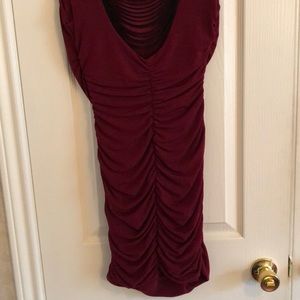 Dark red/maroon rauched dress, zip back with black fringe drape opening