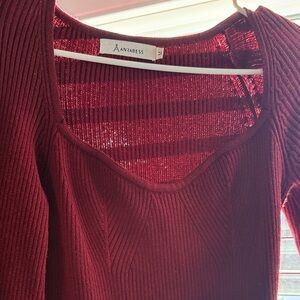 Chic deep red dress with ribbed texture. Features long sleeves and a flattering neckline.