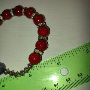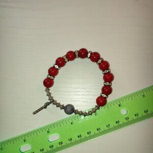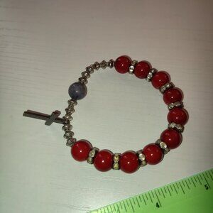 Deep Red Stone Beads Bracelet Cross Charm Christian Vintage Silver Metal Elastic