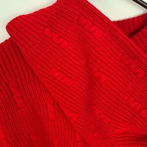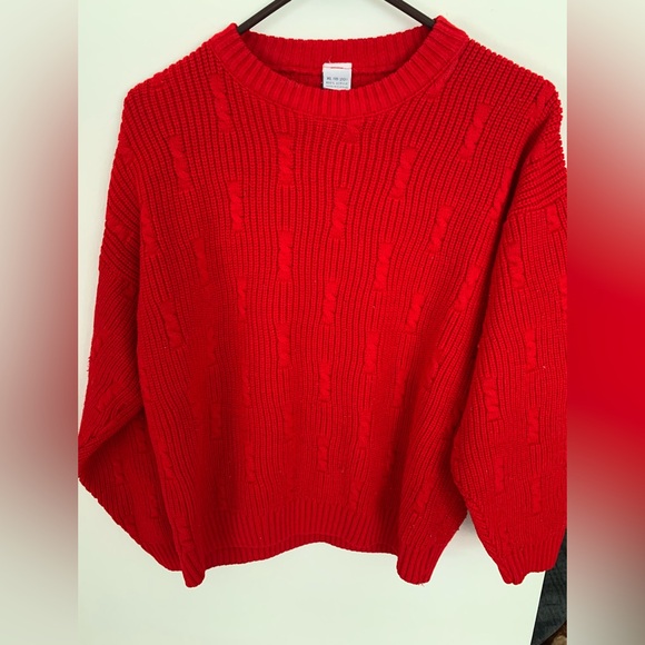 Bright red Bruxton sweater with a classic crew neck. (Could be worn by women.)