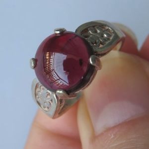Beautiful raspberry red natural garnet cabochon is set in sterling silver filigree setting to create a unique ring. Garnet cabochon (9.94x3.91mm in size) has deep raspberry red/wine color. It will look more raspberry red under the sun and darker wine red in the shadow (please see video).