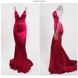 Deep V Neck Backless Ruched Long Slip Sheath Dress Evening Gown Prom