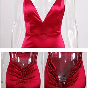 Deep V Neck Backless Ruched Long Slip Sheath Dress