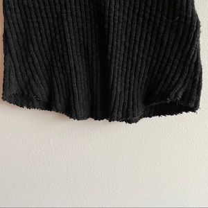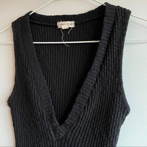 Super sexy, deep V neck top. Thick and stretchy ribbed sweater-like material. Distressed hem. Fabric is slightly worn but in good condition.