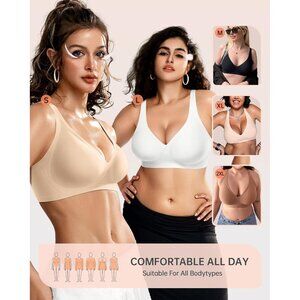 Features: This supportive bralette features a plunging V-neck design that lifts and curves your bust while showing off your collarbones and cleavage — great under low-cut tops or dresses. Built with innovative 3D liquid jelly support, it offers full support without wires, plus side panels that conceal extra fat. The ultra-soft fabric feels feather-light on your skin, breathable, and super stretchy for all-day comfort. The semi-fixed pads with over 200 holes keep you cool, while the U-shaped back and adjustable straps give a smooth, invisible look under clothing.