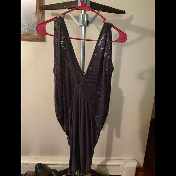 Deep V-cut in front and back sequined top. Soft gray color. Hemline is almost triangular in itself.