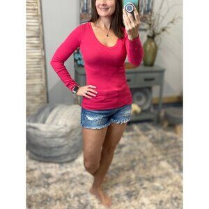 Basic yet sexy long sleeve v-neck thermal waffle knit top. Soft, stretchy and very comfy. Wear alone for a peek of cleavage or with cami for layered look.