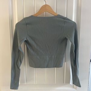 Ribbed dreamy sage/teal long sleeve. Fitted + stretchy with a flattering neckline.