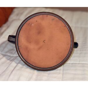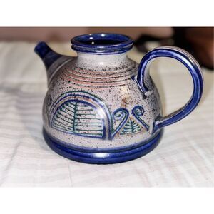 I have a unique little piece here. It has a handle and a spot. It also has an opening at the top. No lid. Really feels "finished ". Really smooth. I don't know anything about this piece. It has a stunning shade of blue. Mixed with the gray just makes it pop. Looks like Clay when you look at the bottom. There is something that looks like it is poking through. See pictures otherwise not a single flaw. Very pretty vase