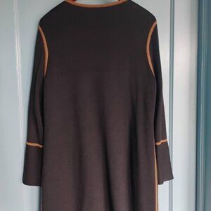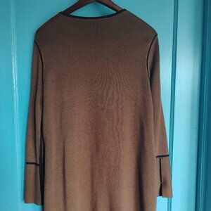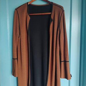 Deep chocolate brown with caramel piping long sweater jacket reverses to caramel with chocolate brown piping. Women's Size 8.