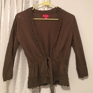 This unique cardigan has beautiful lace detail up the center and around the neck. It cinches to your desired look. Worn a couple of times and in great condition!