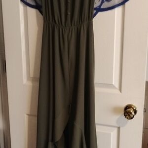 lovely olive color. Woodsy, elven maiden vibes. The top is off shoulder with small buttons down the front and then cinches at the waist to a beautiful ruffled high to low skirt.