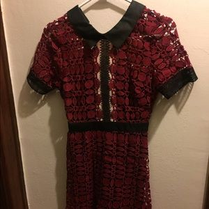 Deep red collared lace dress.