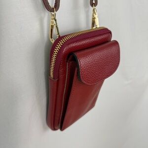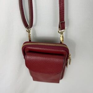 Uno Alla Volta's new deep red genuine leather crossbody purse with adjustable strap, gold zipper closure for main compartment and snap closure for front phone pocket. It measures 8" long, 5" wide, and 1.5" thick when empty.