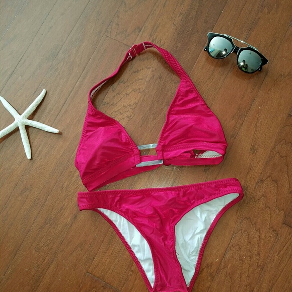 Ruby colored swimsuit with a marbeled chest square. Size medium top and bottom.