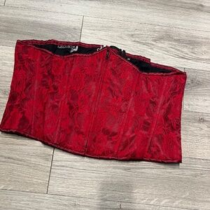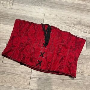 Stunning underbust corset. This corset is a deep rich wine color it only looks bright in the photos. full corset back with plastic boning and a zip front.