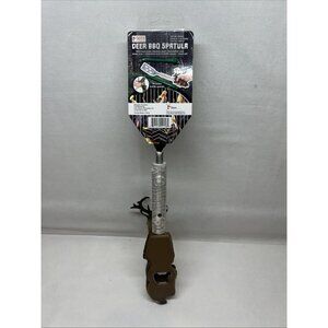 The "Deer 12 Point Buck Stainless Steel Spatula BBQ with Bottle Opener" is a 15-inch spatula designed by Gibson Enterprises. It features a stainless steel head with a 12-point buck deer design, making it a unique and attractive addition to any barbecue tool collection. The spatula also includes a built-in bottle opener, adding convenience for outdoor cooking and entertaining. With its reusable, dishwasher safe, and rust-resistant qualities, this spatula is durable and easy to maintain. The plastic handle provides a comfortable grip while using the utensil, making it a practical and stylish choice for grilling enthusiasts.
